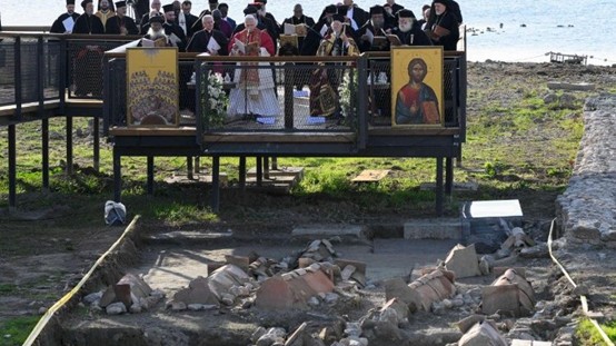 Δίπλα του βρίσκεται ο Οικουμενικός Πατριάρχης Κωνσταντινουπόλεως Βαρθολομαίος Α΄. Στα πόδια τους, τα ερείπια της τρίκλιτης βασιλικής του 4ου αιώνα, αφιερωμένης στον μάρτυρα Άγιο Νεόφυτο, που καταστράφηκε και βυθίστηκε μετά από σεισμό. Καταποντισμένα στη λίμνη, τα ερείπια επανεμφανίστηκαν το 2014 και σήμερα, σε αυτή την εμβληματική τελετή, μοιάζουν να αφηγούνται κι αυτά μια ιστορία: αυτή των πληγών που επουλώνονται και του φωτός που αντιστρατεύεται κάθε σκοτάδι.