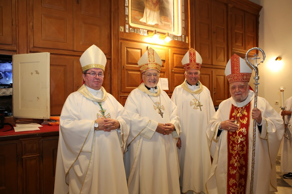 Συλλειτούργησαν μαζί του ο εκπρόσωπος του Αγίου Πατέρα Πάπα Λέοντα, στην Ελλάδα Αποστολικός Νούντσιος Σεβασμιότατος π. Jan Romeo Pawlowski, ο Πρόεδρος της Ιεράς Συνόδου και Αρχιεπίσκοπος Καθολικών Αθηνών π. Θεόδωρος Κοντίδης, ο Αρχιεπίσκοπος Κερκύρας Σεβασμιότατος π. Γεώργιος Αλτουβάς, ο Αρχιεπίσκοπος Νάξου Τήνου Σεβασμιότατος π. Ιωσήφ Πρίντεζης, ο Τοποτηρητής της Επισκοπής Σύρου-Θήρας Κρήτης Σεβασμιότατος π. Σεβαστιανός Ροσσολάτος, ο Έξαρχος των Ελληνορρύθμων Καθολικών Σεβασμιότατος π. Εμμανουήλ Νιν, ο Σεβασμιότατος πρώην Αρχιεπίσκοπος Κερκύρας π. Ιωάννης Σπιτέρης και το σύνολο σχεδόν των Ιερέων-Ιερομονάχων και Διακόνων τόσο της Εκκλησιαστικής Επαρχίας μας όσο και από άλλες Εκκλησιαστικές Επαρχίες.