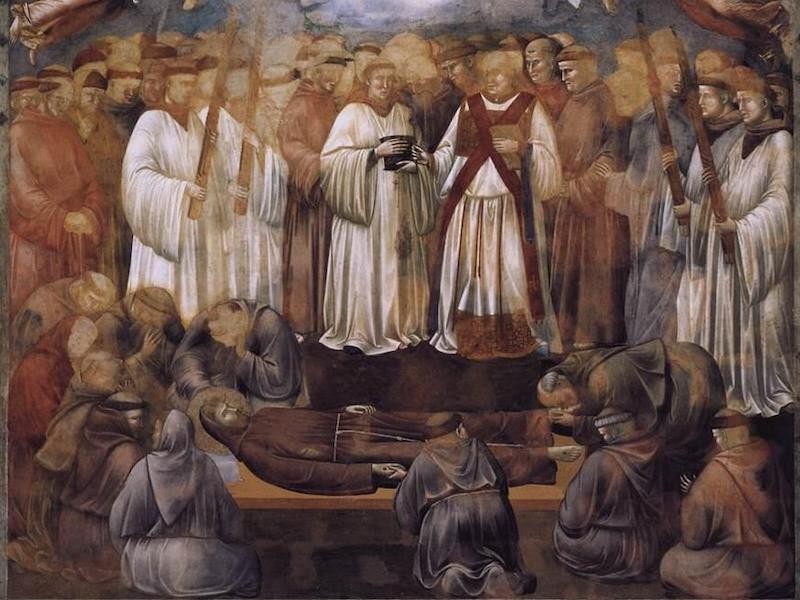Πίνακας: Τοιχογραφία της «Κοίμησης του Αγίου Φραγκίσκου», του Τζιόττο (Giotto). Ο μεγάλος ζωγράφος δημιούργησε την τοιχογραφία αυτή μεταξύ των ετών 1315 και 1320. Βρίσκεται στη Κάτω Βασιλική του Αγ. Φραγκίσκου στην Ασίζη. Παρουσιάζει τον άγιο στο κρεβάτι του θανάτου, περιστοιχισμένο από αδελφούς που θρηνούν και προσεύχονται∙ μια σκηνή γεμάτη ρεαλισμό και συγκίνηση.
