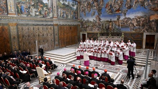 Ο στοχασμός των Χριστουγέννων, υπογράμμισε ο Ποντίφικας απευθυνόμενος στους παρευρισκομένους στο τέλος της εκδήλωσης, εκφράζεται και μέσα από τη «γλώσσα της μουσικής και του τραγουδιού», η οποία είναι ικανή να μιλά τόσο στον νου όσο και στην καρδιά. Αυτό εκφράζουν οι φωνές της χορωδίας, με ιστορία άνω των 1.500 ετών, υπό τη διεύθυνση του μαέστρου, Πανοσιολογιοτάτου π. Μάρκου Παβάν, μαζί με τον Μαέστρο των Pueri Cantores (παιδικών φωνών) Μικέλε Μαρινέλι, τους οποίους ο Λέων ΙΔ΄ ευχαρίστησε θερμά.