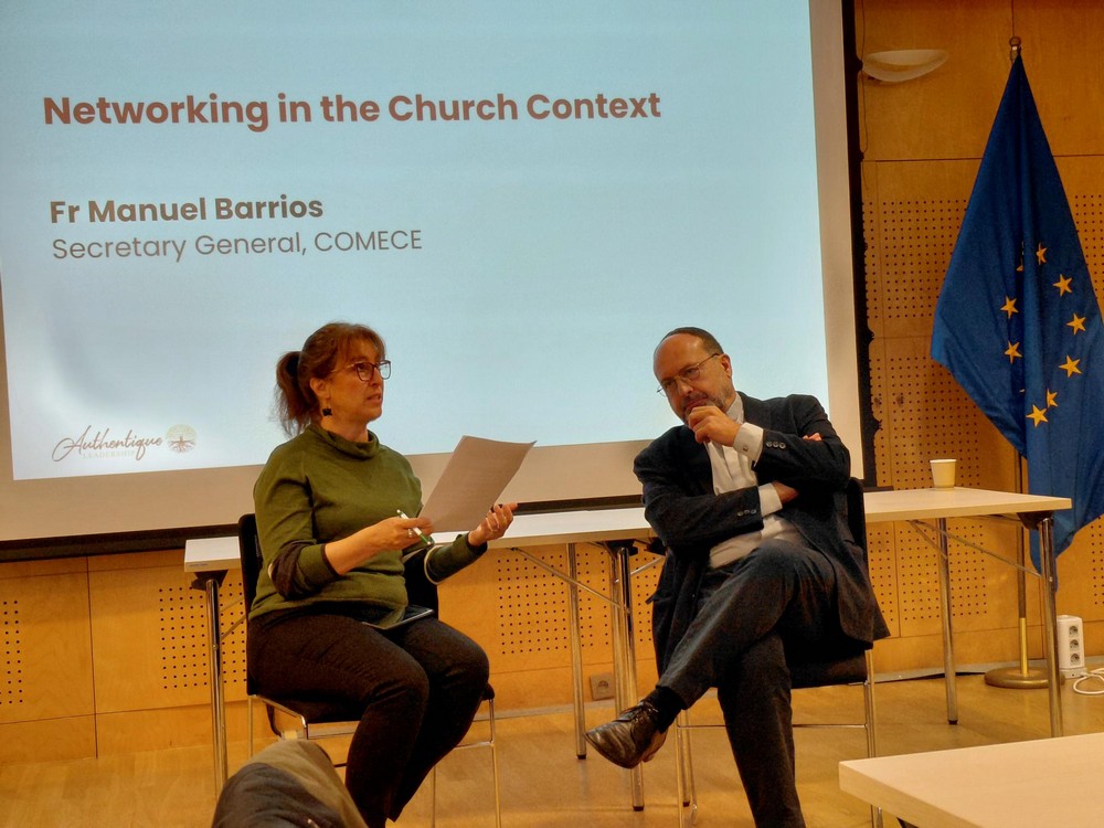 π. Manuel Barrios, Γενικός Γραμματέας της COMECE (φορέας που εκπροσωπεί τις Συνόδους των Καθολικών Επισκόπων των κρατών-μελών της Ευρωπαϊκής Ένωσης) ο οποίος μίλησε για το πώς λειτουργεί ο φορέας ως σύνδεσμος της Καθολικής Εκκλησίας με τα θεσμικά όργανα της Ε.Ε, με φορείς χάραξης πολιτικής και με εταίρους της κοινωνίας των πολιτών.