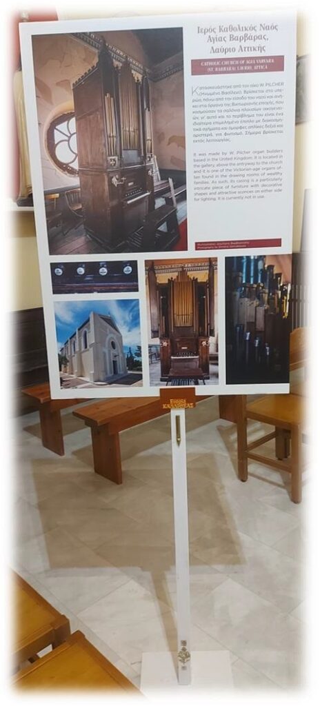 “….το όργανο έχει κατασκευαστεί από τον οίκο W. PILCHER, στο Ηνωμένο Βασίλειο, βρίσκεται στο υπερώο, πάνω από την είσοδο του ναού και ανήκει στα όργανα της Βικτωριανής εποχής, που κοσμούσαν τα σαλόνια πλουσίων οικογενειών.