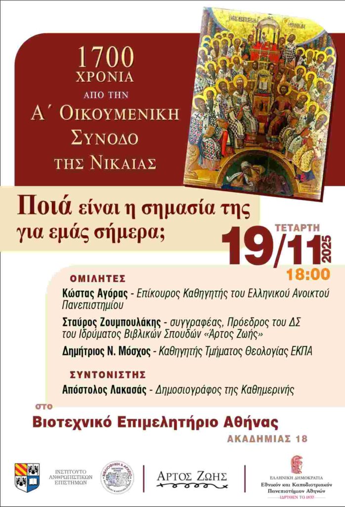 Μια σημαντική εκδήλωση οικουμενικού χαρακτήρα με τίτλο «1700 Χρόνια από την Α΄ Οικουμενική Σύνοδο της Νικαίας: Ποια είναι η Σημασία της για Εμάς Σήμερα;» θα πραγματοποιηθεί την Τετάρτη 19 Νοεμβρίου 2025, στις 18:00, στην Αίθουσα Εκδηλώσεων του Βιοτεχνικού Επιμελητηρίου Αθήνας.