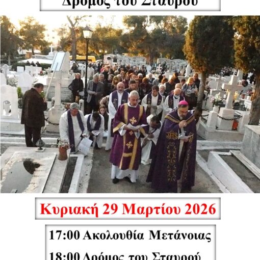 Την Κυριακή 29 Μαρτίου 2026, όπως κάθε χρόνο, μία εβδομάδα πριν την Κυριακή των Βαΐων, η Ιερά Αρχιεπισκοπή Καθολικών Αθηνών κάλεσε το Ποίμνιό της για την Σύναξη της Ιερής Ακολουθίας του Δρόμου του Σταυρού με […]